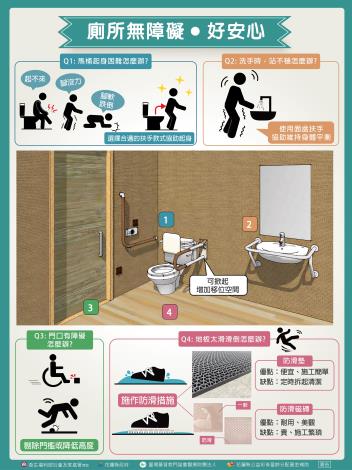 廁所無障礙,好安心 Q1:馬桶起身困難怎麼辦? A1:起不來、腳沒力腳軟跌倒:選擇合適的扶手款式協助起身。 Q2:洗手時,站不穩怎麼辦? A2:使用面盆扶手協助維持身體平衡。 Q3:門口有障礙怎麼辦? A...